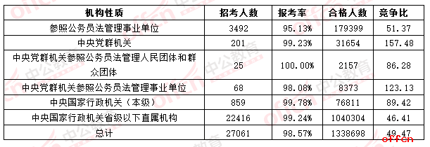 從五大系統(tǒng)分析,僅有中央黨群機(jī)關(guān)參照公務(wù)員法管理人民團(tuán)體和群眾團(tuán)體博考慮達(dá)到百分之百,中央黨群機(jī)關(guān)、中央黨群機(jī)關(guān)參照公務(wù)員法管理事業(yè)單位和中央國(guó)家行政機(jī)關(guān)(本級(jí))這三個(gè)系統(tǒng)均留下一個(gè)“老大難”職位,其中,中央黨群機(jī)關(guān)參照公務(wù)員法管理事業(yè)單位和中央黨群機(jī)關(guān)兩個(gè)系統(tǒng)的競(jìng)爭(zhēng)比例超過(guò)了100:1,分別為123.13、157.48,可見(jiàn)中央黨群是考生偏愛(ài)的對(duì)象。