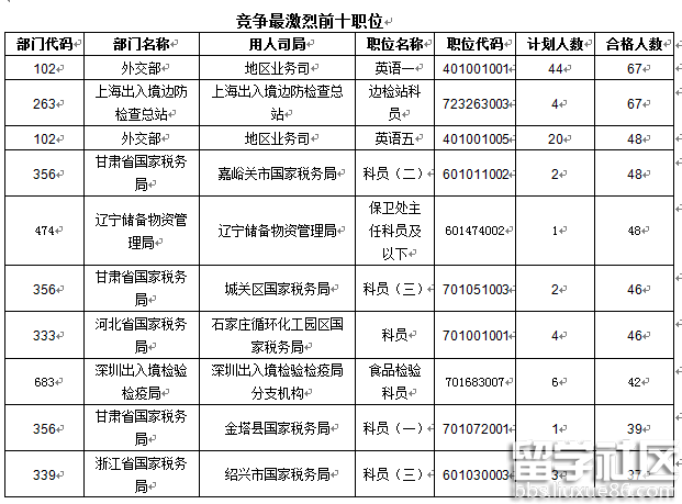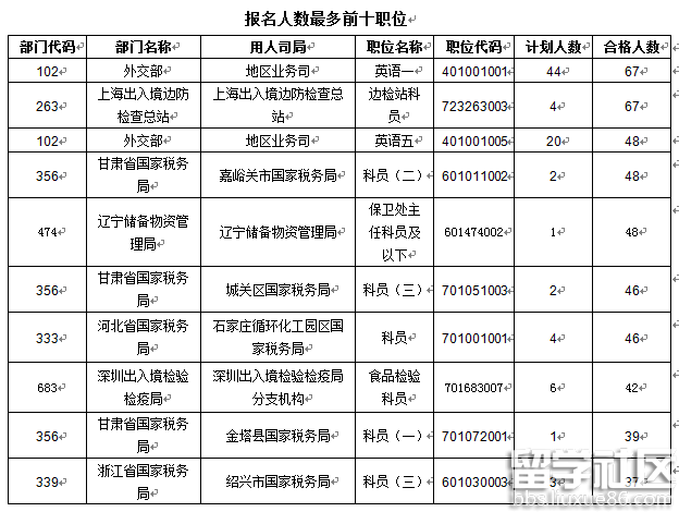 報(bào)名首日的人氣前十榜單涵蓋了外交部、國(guó)稅、出入境邊防檢查總站、遼寧儲(chǔ)備物資管理局等各個(gè)部門(mén),其中,外交部地區(qū)業(yè)務(wù)司英語(yǔ)一(職位代碼 401001001),上海出入境邊防檢查總站邊檢站科員(職位代碼723263003)這兩個(gè)職位目前均擁有了67個(gè)“粉絲”,可謂首日的“人氣雙星”,外交部地區(qū)業(yè)務(wù)司英語(yǔ)一(職位代碼401001001)這一職位招錄44人,規(guī)模較大,且英語(yǔ)屬于大語(yǔ)種,符合條件的考生較多。