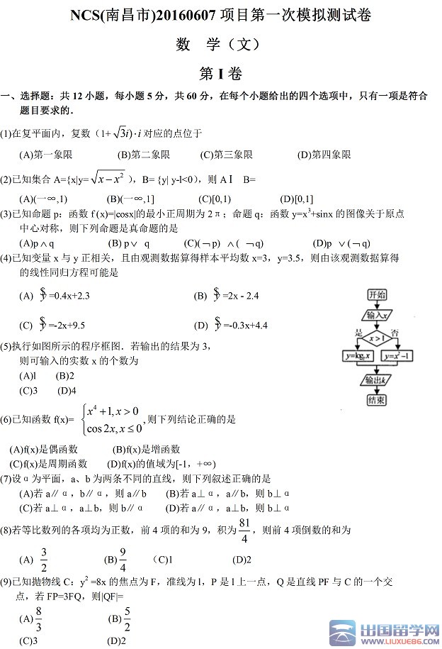 出國留學網(wǎng)高考網(wǎng)為大家提供2016南昌高考文科數(shù)學試題及答案(一模),更多高考數(shù)學試題及高考數(shù)學答案請關(guān)注我們網(wǎng)站的更新!