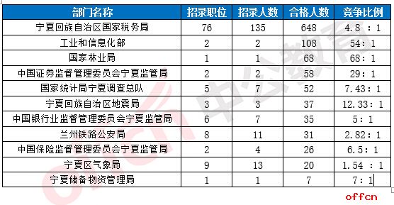 截止到18日16時(shí),寧夏國(guó)考合格人數(shù)前三位的部門依次是:寧夏回族自治區(qū)國(guó)家稅務(wù)局、工業(yè)和信息化部、國(guó)家林業(yè)局。