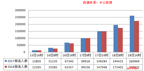 從每日總報名人數(shù)來看,比去年相比略有漲幅,且單日增長量也較為可觀,均保持在5萬以上,說明2017國考正一步步沛然釋放著其無可匹敵的魅力與吸引力。