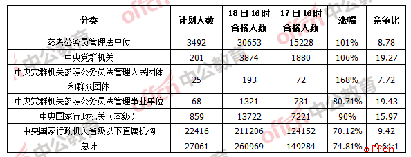 與昨日相比,各個系統(tǒng)的合格人數(shù)都進行了大幅度增長,漲幅最高的是中央黨群機關(guān)參照公務(wù)員法管理人民團體和群眾團體,以168%的漲幅列居首位,漲幅最低的是中央國家行政機關(guān)省級以下直屬機構(gòu),漲幅也在70%以上,目前正是報名高峰期,預(yù)計未來幾天各系統(tǒng)的報名人數(shù)仍將直線式增長。