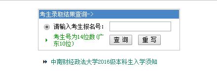 2016中南財(cái)經(jīng)政法大學(xué)高考錄取查詢系統(tǒng):http://bkzs.znufe.edu.cn/result/