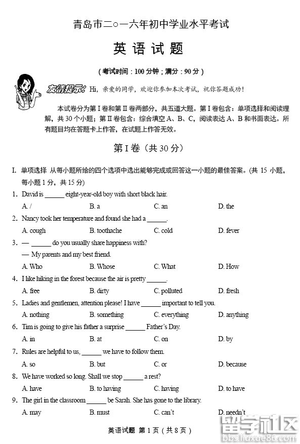 以下是出國留學(xué)網(wǎng)小編為大家?guī)淼纳綎|青島2016中考英語試題,詳細內(nèi)容如下,希望能對大家有所幫助!預(yù)祝各位考生都能取得好的成績!