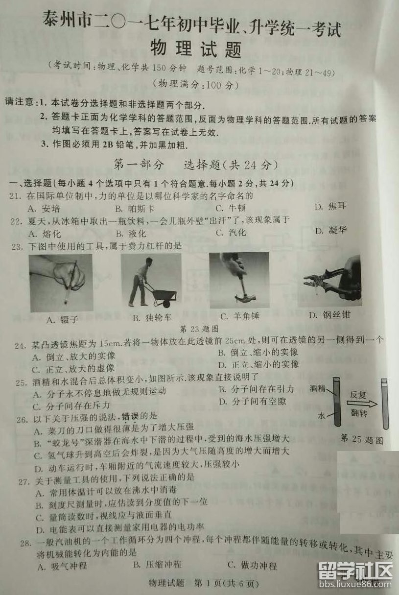 天道酬勤!豐碩的果實永遠屬于那些堅強不屈自強不息的辛勤耕耘者。本文“[泰州2017年中考物理試卷已發(fā)布]”由出國留學網(wǎng)中考欄目編輯整理,希望能幫您!