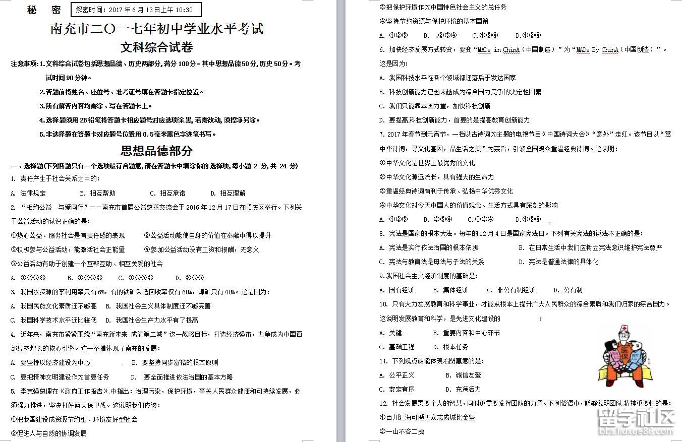 天道酬勤!豐碩的果實永遠屬于那些堅強不屈自強不息的辛勤耕耘者。本文“[2017年南充中考政治真題及答案(word版)]”由出國留學網(wǎng)中考欄目編輯整理,希望能幫您!