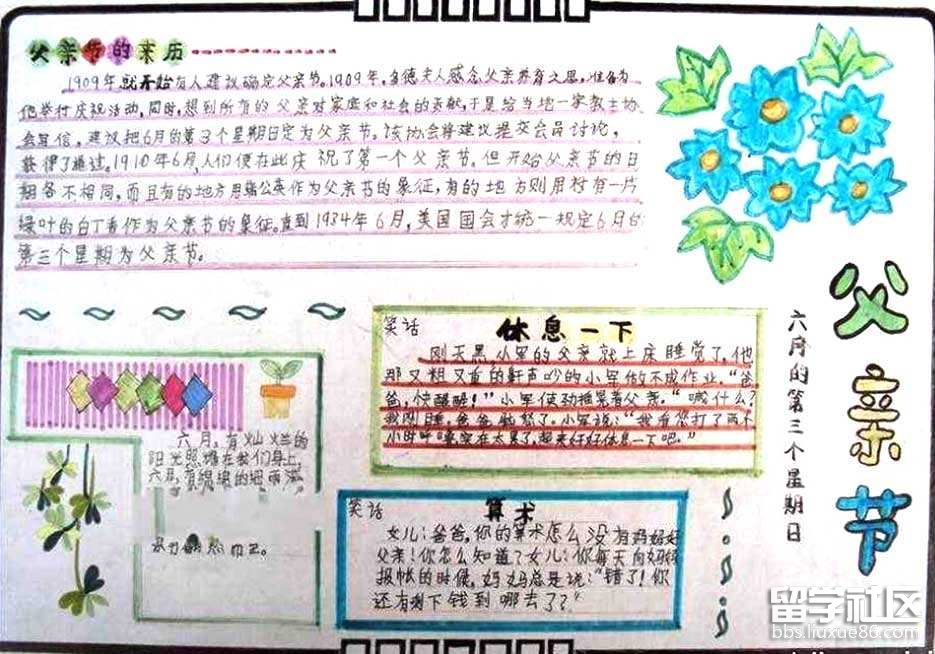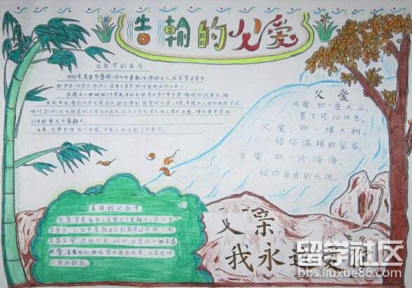 出國(guó)留學(xué)網(wǎng)小編給大家?guī)砹烁卸鞲赣H節(jié)手抄報(bào)圖片大全,父親節(jié)就要到了,畫一副好看的父親節(jié)手抄報(bào)來表達(dá)對(duì)父親的愛,也記得多關(guān)心下父親,謝謝閱讀。