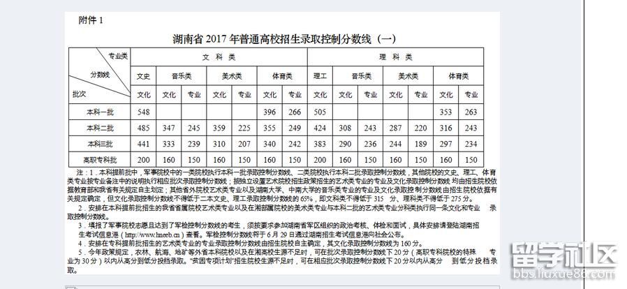 湖南省2017普通高校招生錄取控制分數(shù)線