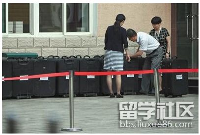 昨日,海淀招考中心,考試工作人員清點裝有高考試卷的箱子。