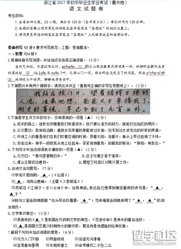 不以成敗論英雄,努力過后才是最好的青春。出國留學(xué)網(wǎng)中考頻道小編緊密關(guān)注“[2017年衢州中考語文試題附答案(word版)]”,幫助考生分析試卷及解題思路,為你的人生道路更加順暢而努力。本網(wǎng)站將在第一時(shí)間為您奉獻(xiàn)中考真題。