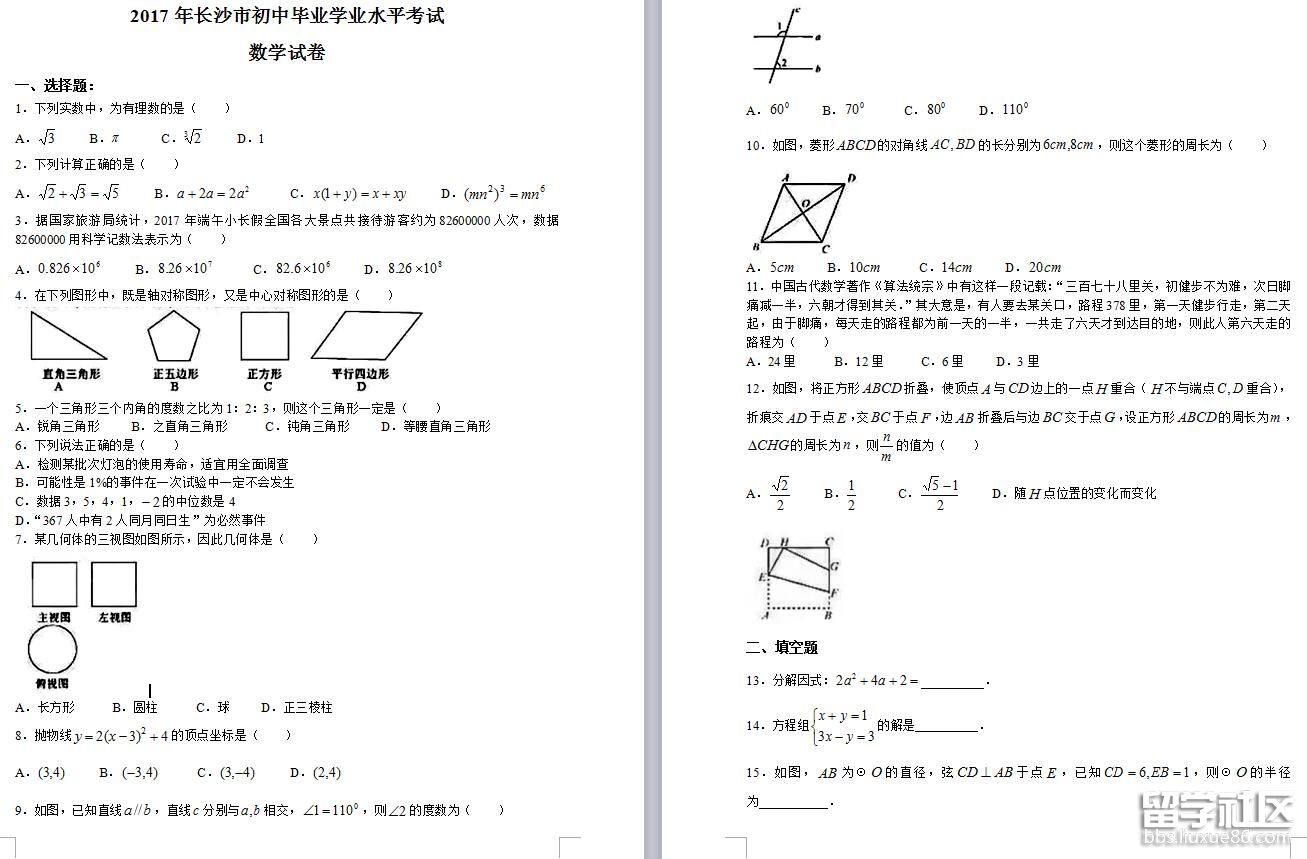 書山有路勤為徑、學(xué)海無涯苦作舟;海到無邊天作岸、山登絕頂我為峰。出國留學(xué)網(wǎng)中考頻道第一時(shí)間整理出[2017年長沙中考數(shù)學(xué)真題含答案(word版)],希望對你有幫助。