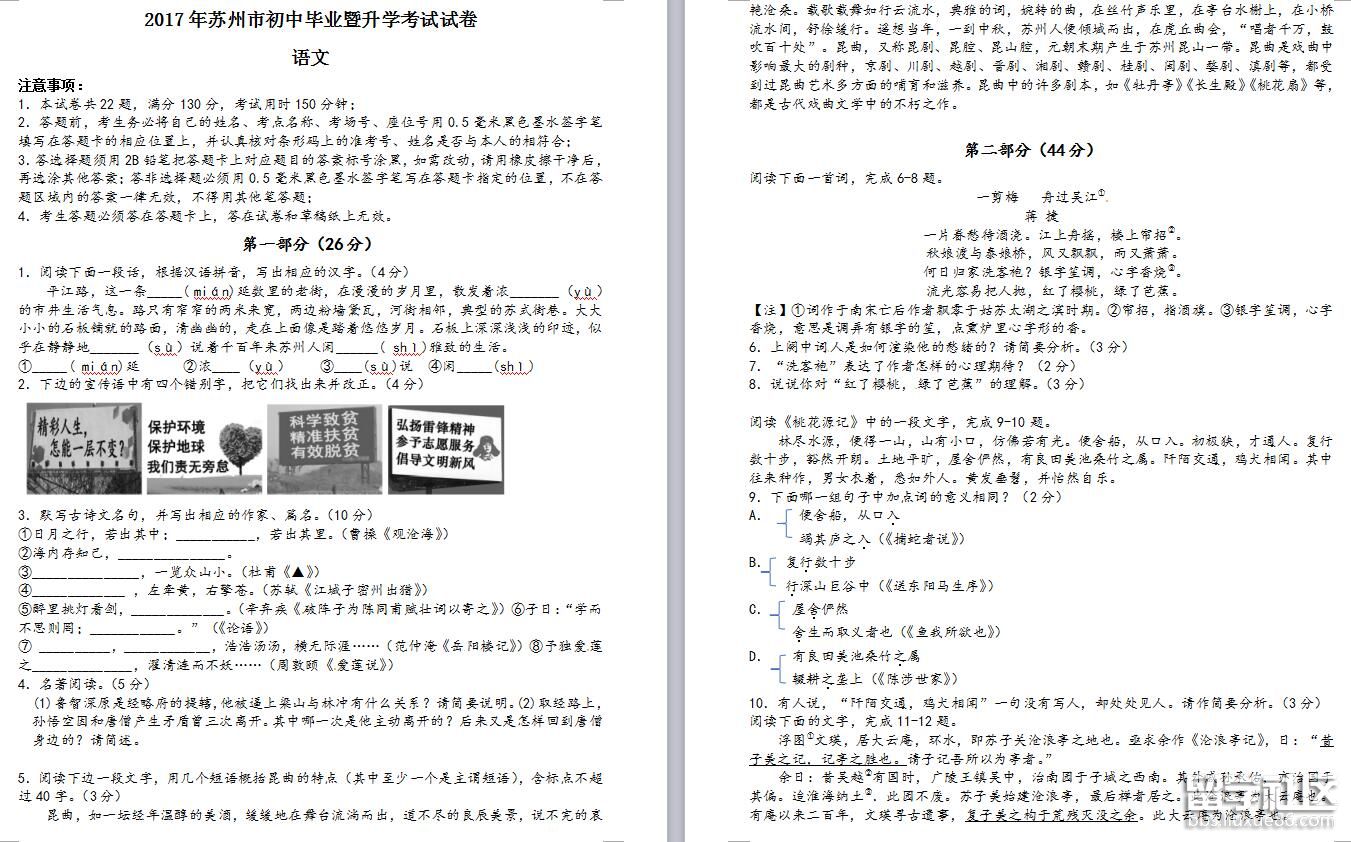 天道酬勤!豐碩的果實永遠(yuǎn)屬于那些堅強(qiáng)不屈自強(qiáng)不息的辛勤耕耘者。本文“[2017年蘇州中考語文真題及答案(word版)]”由出國留學(xué)網(wǎng)中考欄目編輯整理,希望能幫您!