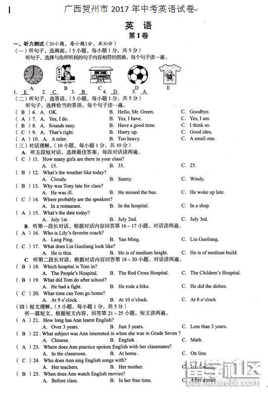 付出終有收獲,努力會有結(jié)果,功名成就在即,此刻莫要焦慮,心中會有擔(dān)憂,黎明前的節(jié)奏,中考就如行舟,隨風(fēng)隨水無憂。出國留學(xué)網(wǎng)中考欄目為你提供“[賀州中考英語2017年試題及答案]”!更多中考內(nèi)容請持續(xù)關(guān)注本站!