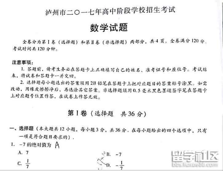 人生就是一考場,準備充分成績好。拼搏努力全做到,結(jié)果怎樣無愧心。人生之路千萬條,未必就是讀書高。考場之上人輕松,超常發(fā)揮不慌張。本文《2017年瀘州中考數(shù)學(xué)試題附答案(圖片版)》由中考欄目提供,出國留學(xué)網(wǎng)愿你中考盡全力,學(xué)業(yè)有成人歡笑!