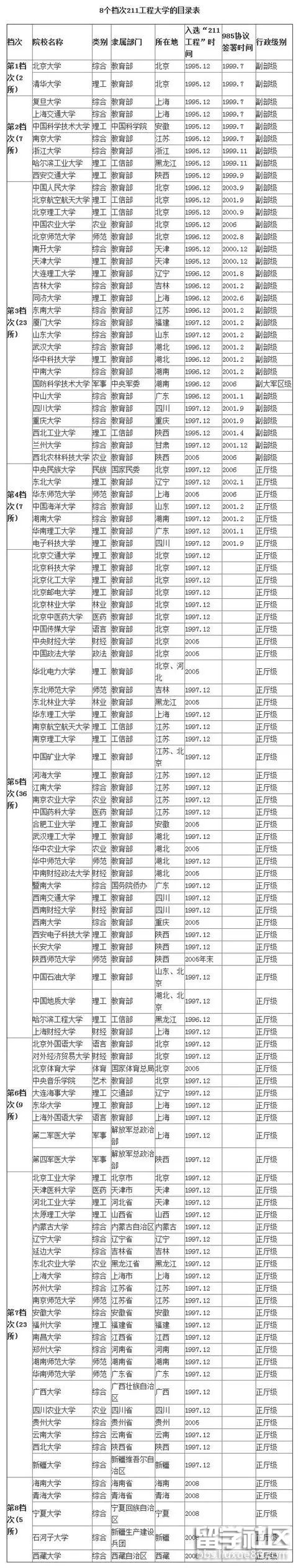 這個(gè)相對(duì)簡(jiǎn)單,只是從高校校長(zhǎng)的行政級(jí)別來(lái)進(jìn)行劃分。有31所高校行政級(jí)別都為副部級(jí)(一般本科以上高校都是廳局級(jí),專(zhuān)科高校是副廳局級(jí)),加上副大軍區(qū)級(jí)的國(guó)防科學(xué)技術(shù)大學(xué)共計(jì)32所。這對(duì)于學(xué)生沒(méi)有什么直接的影響,不過(guò)從行政級(jí)別可以看出學(xué)校的行政地位和國(guó)家的重視程度。這32所高校也都是國(guó)家“985工程”重點(diǎn)建設(shè)的大學(xué)(除東北大學(xué)、華南理工大學(xué)、湖南大學(xué)、電子科技大學(xué)、中國(guó)海洋大學(xué)、中央民族大學(xué)和華東師范大學(xué)外)。