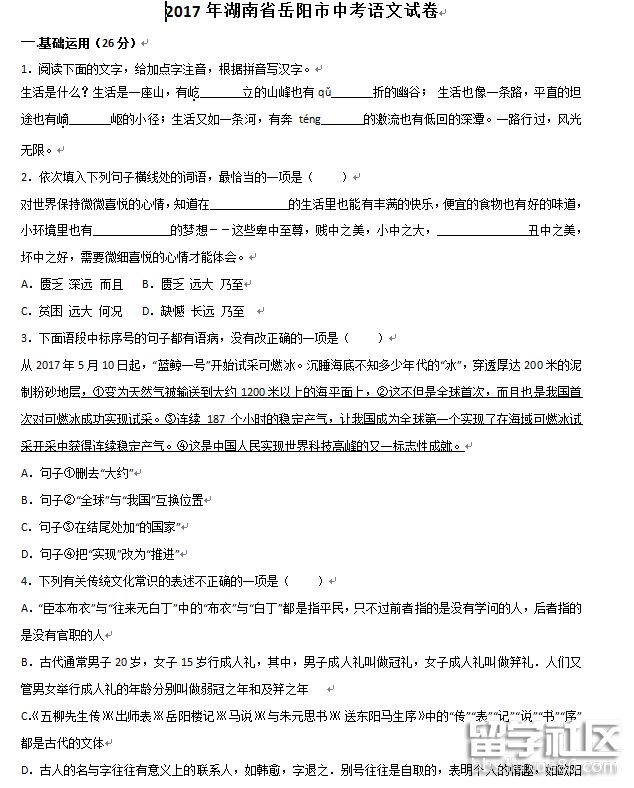 付出終有收獲,努力會有結(jié)果,功名成就在即,此刻莫要焦慮,心中會有擔(dān)憂,黎明前的節(jié)奏,中考就如行舟,隨風(fēng)隨水無憂。出國留學(xué)網(wǎng)中考欄目為你提供“[2017年岳陽中考語文試卷及答案(word版)]”!更多中考內(nèi)容請持續(xù)關(guān)注本站!