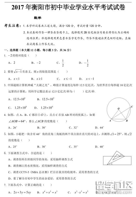 2017年中考,愿你執(zhí)才高八斗生輝筆,飲才思萬(wàn)千智慧水,帶氣定神閑滿面笑,擁胸中成竹滿懷志,書錦繡嫣然好答卷,定折取桂冠來(lái)題名。出國(guó)留學(xué)網(wǎng)中考網(wǎng)為大家提供[2017年衡陽(yáng)中考數(shù)學(xué)試卷],更多中考資訊請(qǐng)關(guān)注我們網(wǎng)站的更新!