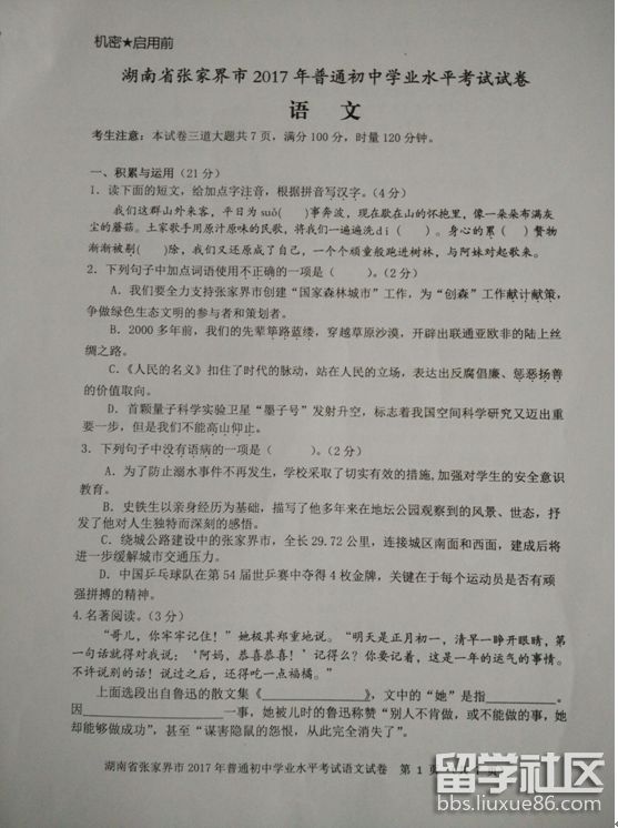 六月注定是不平凡的一個(gè)月,很多人大學(xué)畢業(yè)了,從此開始進(jìn)入社會(huì)工作;很多人高中畢業(yè)了,結(jié)束了自己青澀的中學(xué)時(shí)光。中考已然成為過去,你是否表現(xiàn)出了最好的自己呢?出國(guó)留學(xué)網(wǎng)出國(guó)留學(xué)網(wǎng)中考頻道為您提供[張家界中考語(yǔ)文2017年試卷及答案]。更多中考分?jǐn)?shù)線、中考成績(jī)查詢、中考志愿填報(bào)、中考錄取查詢信息等信息請(qǐng)關(guān)注我們網(wǎng)站的更新!