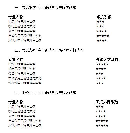 綜上數(shù)據(jù)得出,建筑工程專業(yè)考試難度較低,考試人數(shù)多,相應(yīng)的工作收入也較低,市政和水利考試難度相對較高,相應(yīng)的工資收入也是比較可觀的。