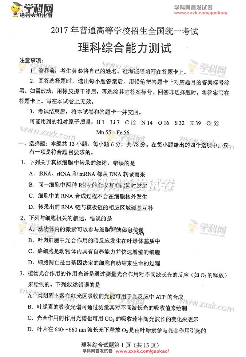 2017年高考全國卷3理綜真題適用地區(qū):云南、廣西、貴州、四川