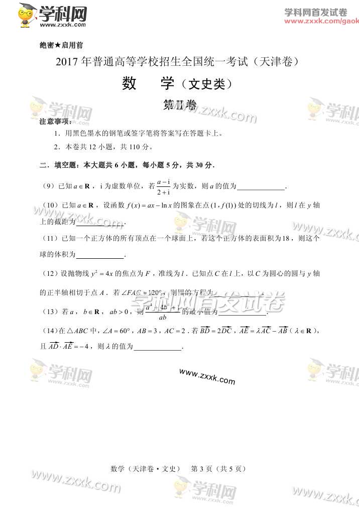 天津2017年高考文科數(shù)學試題(含答案)