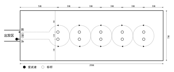 場(chǎng)地設(shè)置在籃球場(chǎng)內(nèi)或者平整的塑膠場(chǎng)地上。設(shè)置要求如下:長(zhǎng)20米,寬7米。起點(diǎn)線前5米處開始設(shè)置標(biāo)志桿,共設(shè)5排,每排2根;各排標(biāo)志桿之間相距3米,同排的兩根標(biāo)志桿底座中心點(diǎn)之間相距1米,距同側(cè)邊線3米。起點(diǎn)線中間1米處為出發(fā)區(qū)域。設(shè)置方式如圖所示:
