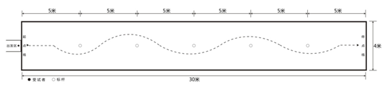 長(zhǎng)30米,寬4米,場(chǎng)地四周設(shè)置明顯的標(biāo)志線。起點(diǎn)線前5米處開始設(shè)置標(biāo)志桿,標(biāo)志桿與兩側(cè)邊線相距2米,共設(shè)5根,各桿之間相距5米。起點(diǎn)線中間1米處為考生出發(fā)區(qū)域。設(shè)置方式如圖所示: