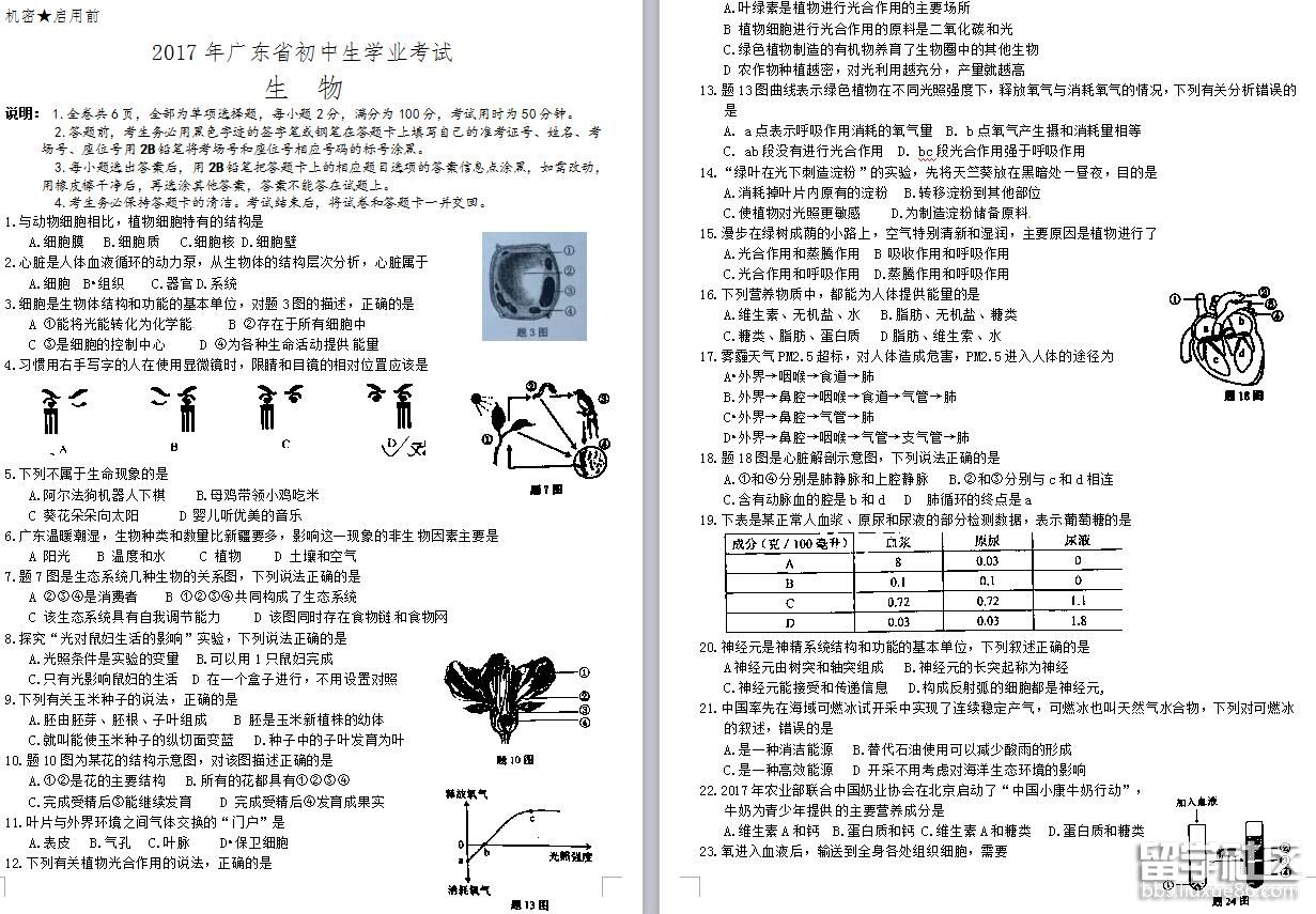 2017年中考,愿你執(zhí)才高八斗生輝筆,飲才思萬千智慧水,帶氣定神閑滿面笑,擁胸中成竹滿懷志,書錦繡嫣然好答卷,定折取桂冠來題名。出國留學(xué)網(wǎng)中考網(wǎng)為大家提供[2017年廣東中考生物試題公布],更多中考資訊請關(guān)注我們網(wǎng)站的更新!