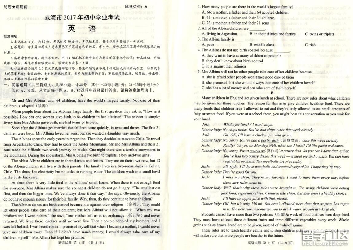 2017年中考,愿你執(zhí)才高八斗生輝筆,飲才思萬千智慧水,帶氣定神閑滿面笑,擁胸中成竹滿懷志,書錦繡嫣然好答卷,定折取桂冠來題名。出國留學(xué)網(wǎng)中考網(wǎng)為大家提供[2017年威海中考英語真題及答案發(fā)布],更多中考資訊請(qǐng)關(guān)注我們網(wǎng)站的更新!