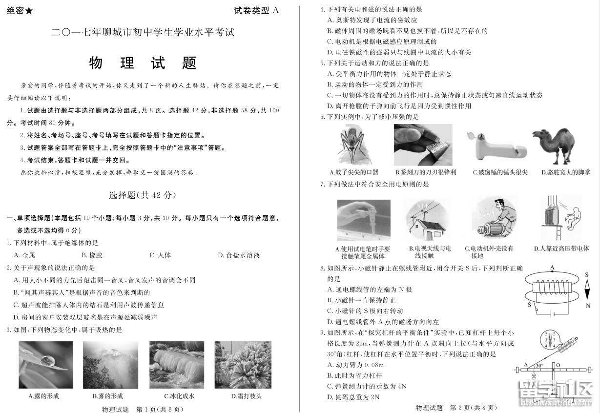 2017年中考,愿你執(zhí)才高八斗生輝筆,飲才思萬千智慧水,帶氣定神閑滿面笑,擁胸中成竹滿懷志,書錦繡嫣然好答卷,定折取桂冠來題名。出國留學(xué)網(wǎng)中考網(wǎng)為大家提供[2017年聊城中考物理真題含答案],更多中考資訊請關(guān)注我們網(wǎng)站的更新!