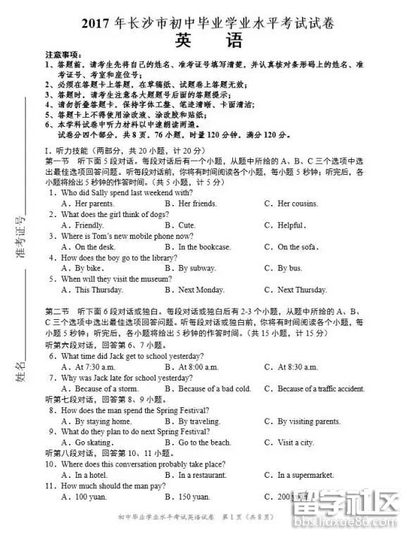 “三年礪劍今日策馬闖雄關(guān),一朝試鋒六月?lián)P眉凱歌旋。”下面是出國(guó)留學(xué)網(wǎng)為考生們提供的[2017年長(zhǎng)沙中考英語(yǔ)試卷含答案]。祝各位考生取得優(yōu)異的成績(jī)。更多中考資訊請(qǐng)關(guān)注中考欄目!