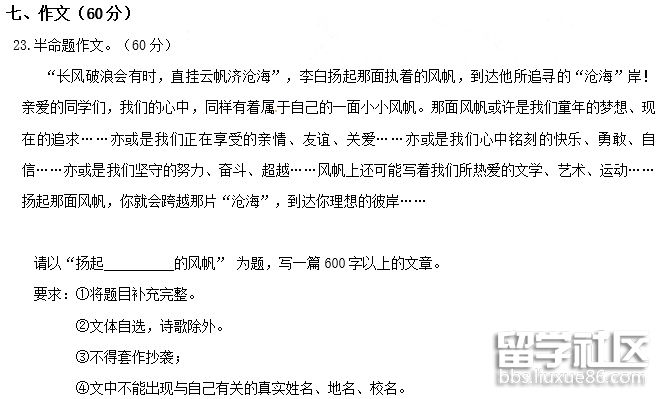 愿全國(guó)所有的考生都能以平常的心態(tài)參加中考,發(fā)揮自己的水平,考上理想的學(xué)校。本文《2017年樂(lè)山中考作文題目揭曉:揚(yáng)起_________的風(fēng)帆》由中考欄目提供,出國(guó)留學(xué)網(wǎng)祝你成功!