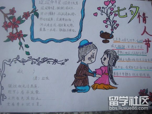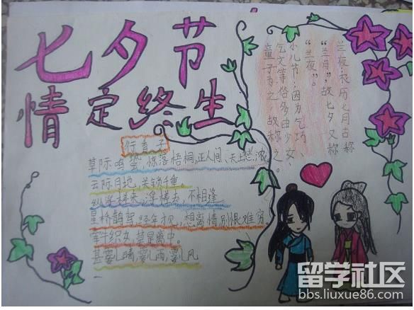 七夕情人節(jié)又到了,又到了牛郎織女相會(huì)的一天,這一天是中國的傳統(tǒng)節(jié)日,又叫做乞巧節(jié)。下面是出國留學(xué)網(wǎng)小編為大家?guī)淼呐@煽椗呦κ殖瓐?bào)圖片,歡迎閱讀。