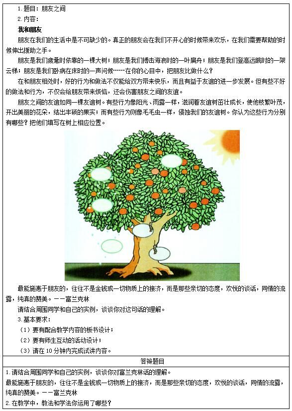 本文“2017上半年小學(xué)思想品德教師面試真題:朋友之間”由出國留學(xué)網(wǎng)教師資格考試網(wǎng)整理而出,希望能幫到你!