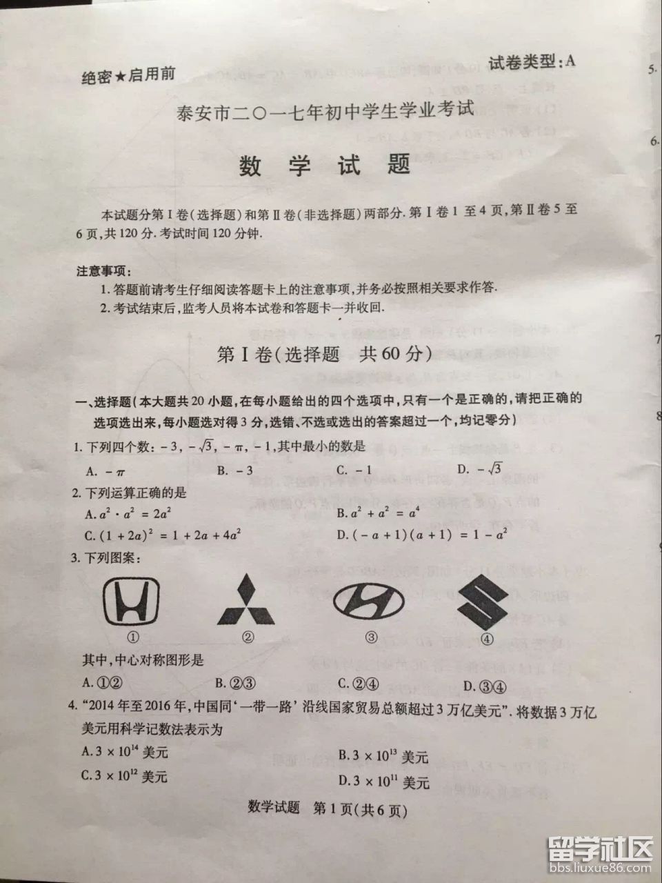 人生就是一考場,準(zhǔn)備充分成績好。拼搏努力全做到,結(jié)果怎樣無愧心。人生之路千萬條,未必就是讀書高。考場之上人輕松,超常發(fā)揮不慌張。本文《2017年泰安中考數(shù)學(xué)真題及答案發(fā)布》由中考欄目提供,出國留學(xué)網(wǎng)愿你中考盡全力,學(xué)業(yè)有成人歡笑!