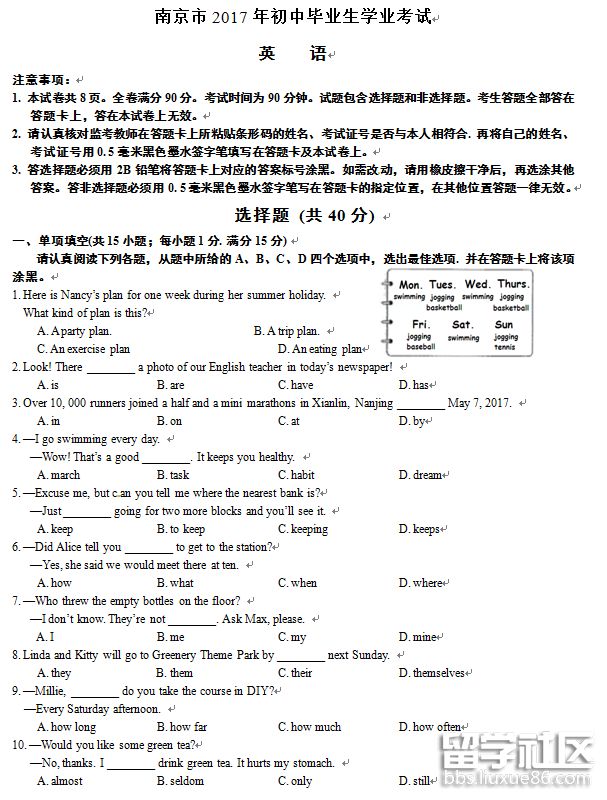 付出終有收獲,努力會(huì)有結(jié)果,功名成就在即,此刻莫要焦慮,心中會(huì)有擔(dān)憂(yōu),黎明前的節(jié)奏,中考就如行舟,隨風(fēng)隨水無(wú)憂(yōu)。出國(guó)留學(xué)網(wǎng)中考欄目為你提供“[南京中考英語(yǔ)2017年試卷及答案]”!更多中考內(nèi)容請(qǐng)持續(xù)關(guān)注本站!