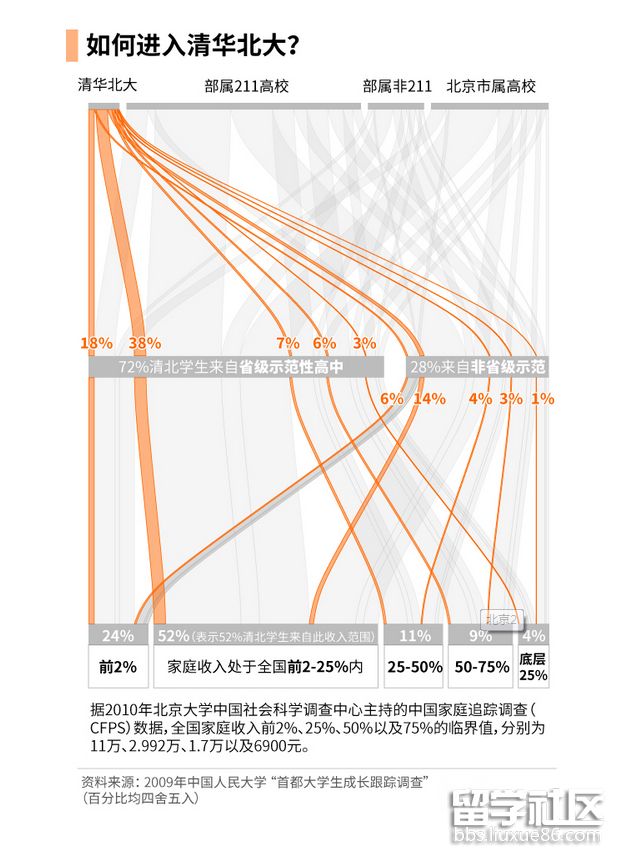 調(diào)查數(shù)據(jù)顯示,2009年清北學(xué)生中有72%是來自于省級示范性高中,是非省級示范性高中的兩倍多。