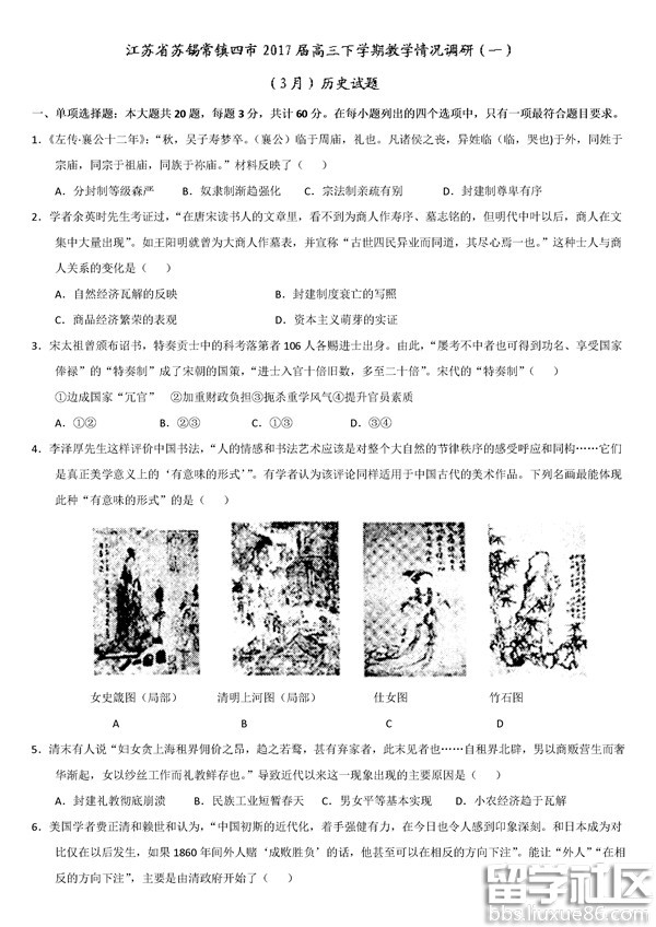2017蘇錫常鎮(zhèn)高三調(diào)研(一)正在進(jìn)行中,出國(guó)留學(xué)網(wǎng)高考網(wǎng)小編整理了2017蘇錫常鎮(zhèn)四市一模歷史試題及答案,供同學(xué)們參考學(xué)習(xí)。更多高考一模試題及答案請(qǐng)點(diǎn)擊>>>全國(guó)各省市2017高三一模(高三一診)試題及答案匯總