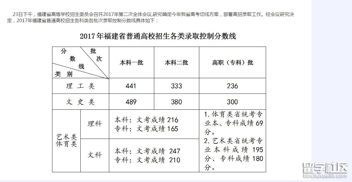 福建高考,本科一批理科441分,本科一批文科489分,本科二批理科333分,本科二批文科380,專科理科236分,專科文科300分