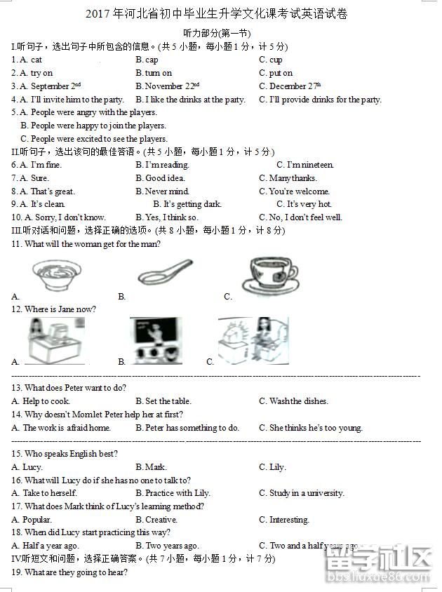 信心來(lái)自于實(shí)力,實(shí)力來(lái)自于勤奮!出國(guó)留學(xué)網(wǎng)中考頻道第一時(shí)間為您提供[2017年河北中考英語(yǔ)真題含答案(word版)],希望大家及時(shí)關(guān)注本頁(yè)面,可按Ctrl+D收藏本頁(yè)面。想了解中考成績(jī)查詢、分?jǐn)?shù)線、志愿填報(bào)、錄取查詢等相關(guān)信息請(qǐng)關(guān)注我們網(wǎng)站的更新!