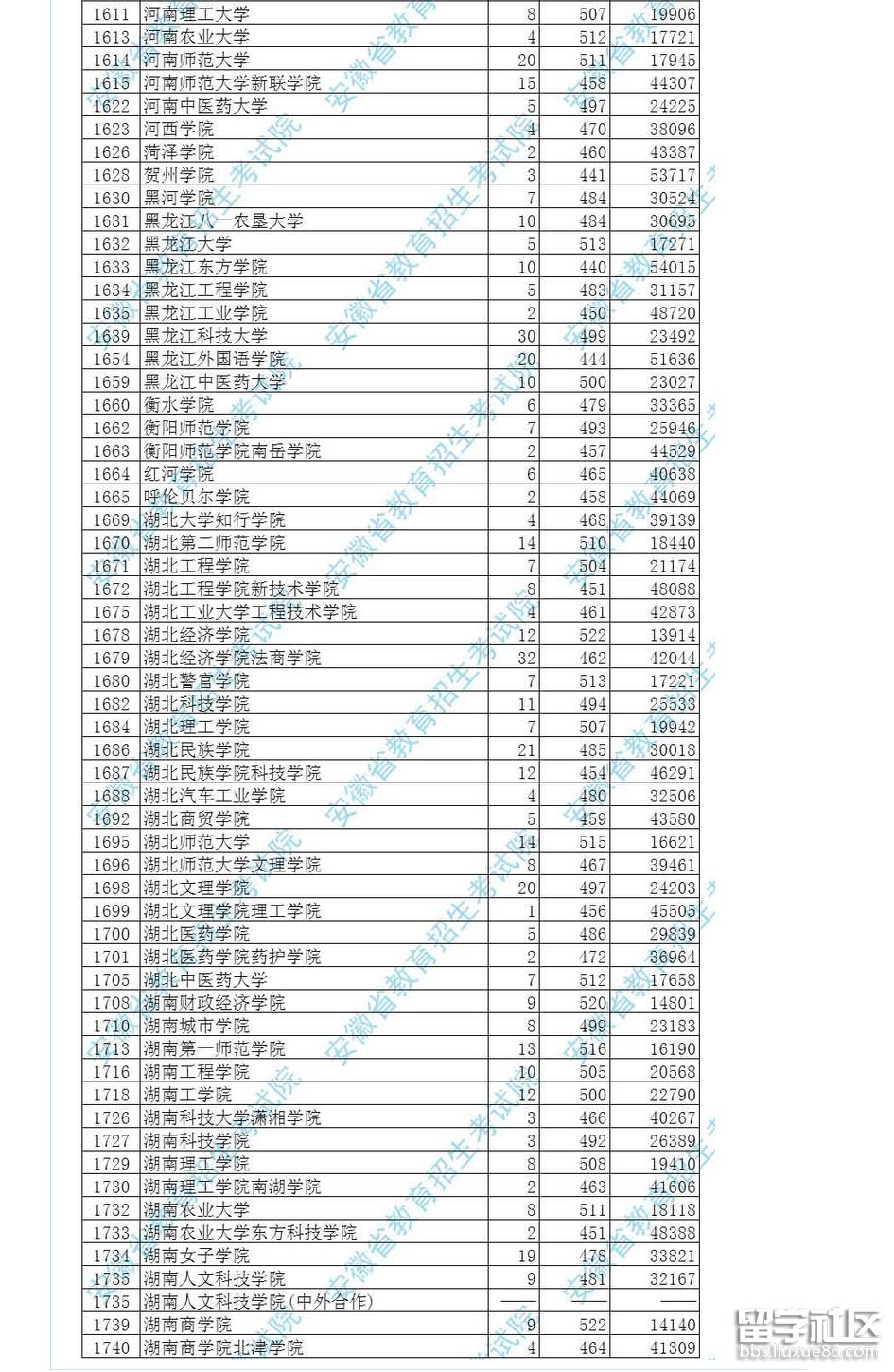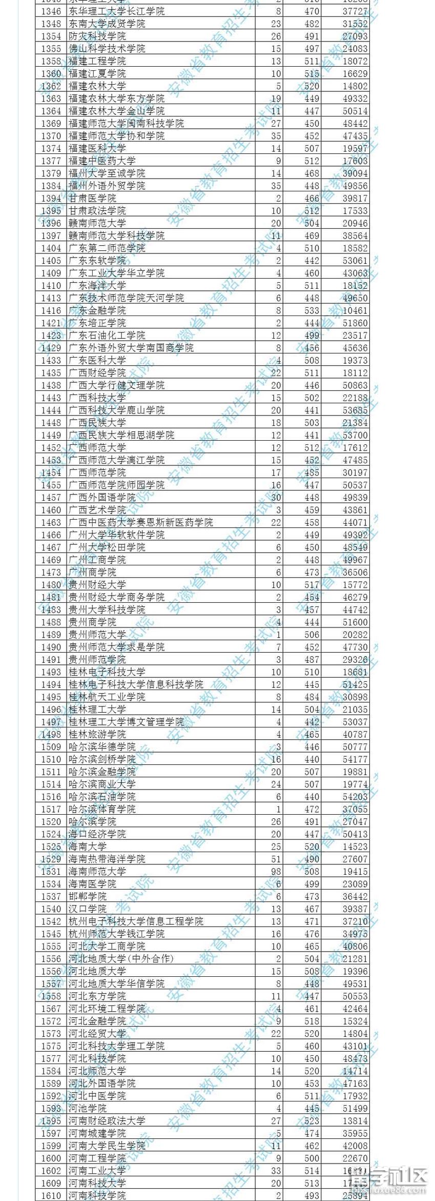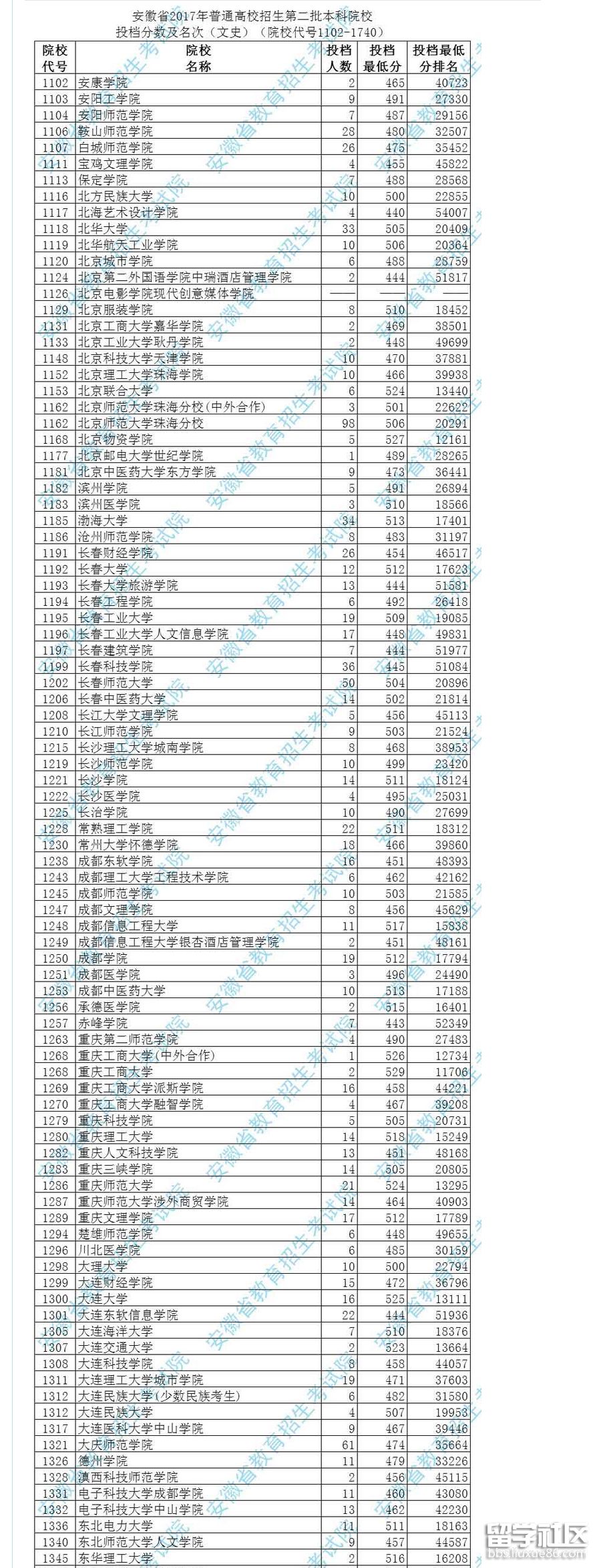 2017安徽文史本科第二批院校投檔分?jǐn)?shù)(1102-1740)