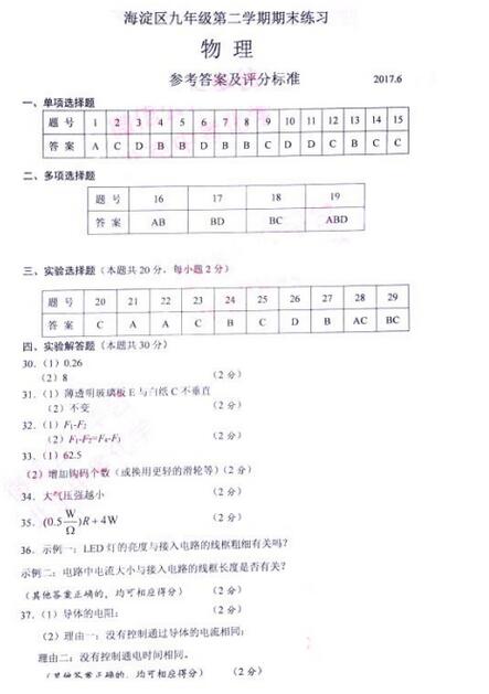 2017海淀區(qū)初三二??荚囈呀?jīng)結(jié)束,出國(guó)留學(xué)網(wǎng)中考網(wǎng)整理了《北京海淀區(qū)2017中考二模物理答案》,供同學(xué)們和家長(zhǎng)參考。