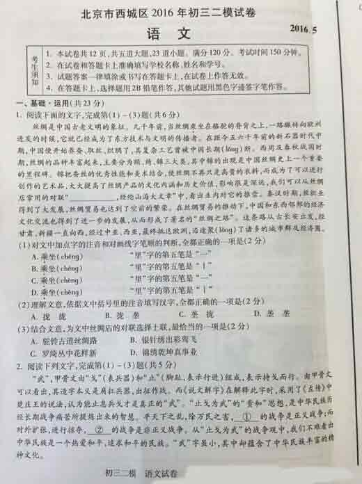 2016北京西城區(qū)中考二模語文考試已經(jīng)結(jié)束,出國留學網(wǎng)中考網(wǎng)整理了《2016北京西城區(qū)中考二模語文試題及答案》,供同學們參考。