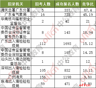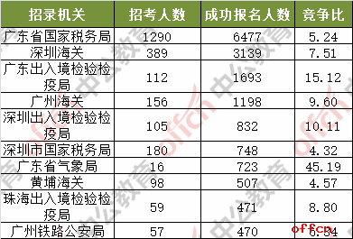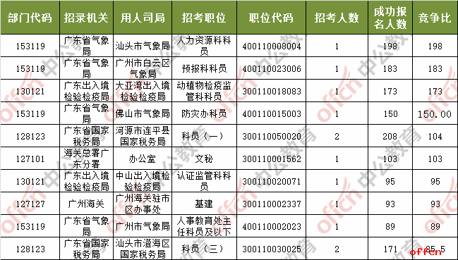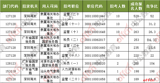 報(bào)名通過(guò)審核人數(shù)前十的職位主要集中在深圳海關(guān)、廣東省國(guó)家稅務(wù)局、廣東省氣象局等部門,具體信息如下: