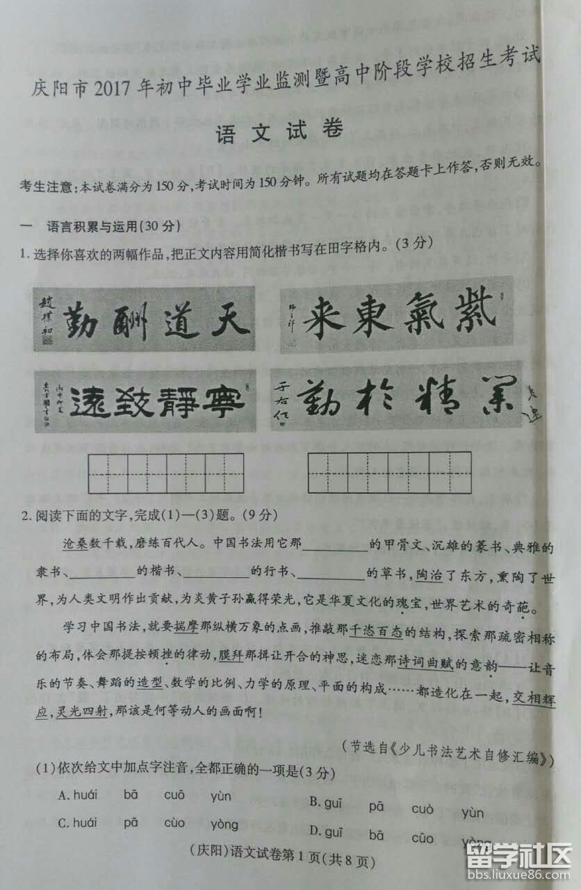 人生就是一考場,準(zhǔn)備充分成績好。拼搏努力全做到,結(jié)果怎樣無愧心。人生之路千萬條,未必就是讀書高??紙鲋先溯p松,超常發(fā)揮不慌張。本文《2017年慶陽中考語文真題》由中考欄目提供,出國留學(xué)網(wǎng)愿你中考盡全力,學(xué)業(yè)有成人歡笑!