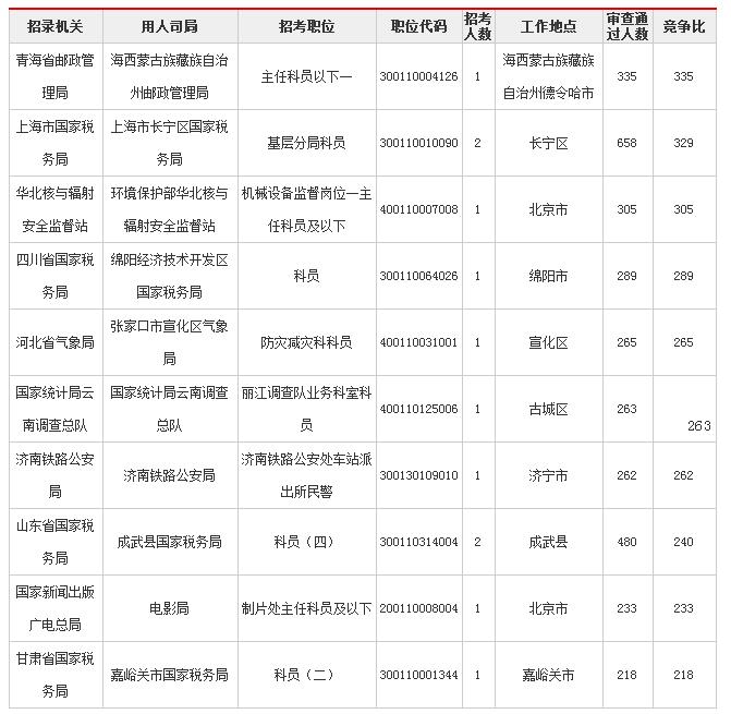2018年國(guó)家公務(wù)員考試報(bào)名第三天,報(bào)名人數(shù)正在快速攀升,截止11月1日16時(shí),根據(jù)統(tǒng)計(jì)數(shù)據(jù),已經(jīng)接近27萬(wàn)報(bào)考,審核通過(guò)人數(shù)接近16萬(wàn),相比去年基本持平。但是比較有意思的是,通過(guò)數(shù)據(jù)發(fā)現(xiàn),今年競(jìng)爭(zhēng)比例最激烈的前十個(gè)職位,除了一個(gè)來(lái)自中央行政機(jī)關(guān)本部,其余全是基層職位,西北地區(qū)職位占據(jù)了四席,這是和以往不同的局面,目前,競(jìng)爭(zhēng)最激烈的職位為青海省郵政管理局海西蒙古族藏族自治州郵政管理局主任科員以下一(職位代碼300110004126),競(jìng)爭(zhēng)比335:1,僅招錄1人。
