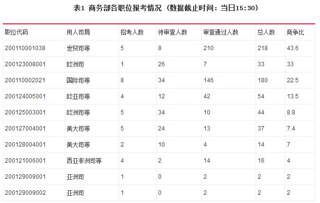 截止到2017年11月1日15:30分,商務(wù)部共有600人報名,450人通過審查。其中,競爭力度最大的仍然是“世貿(mào)司等”用人司局的招考職位“英語一”,報考人數(shù)與招考人數(shù)的競爭比達到43.6:1。