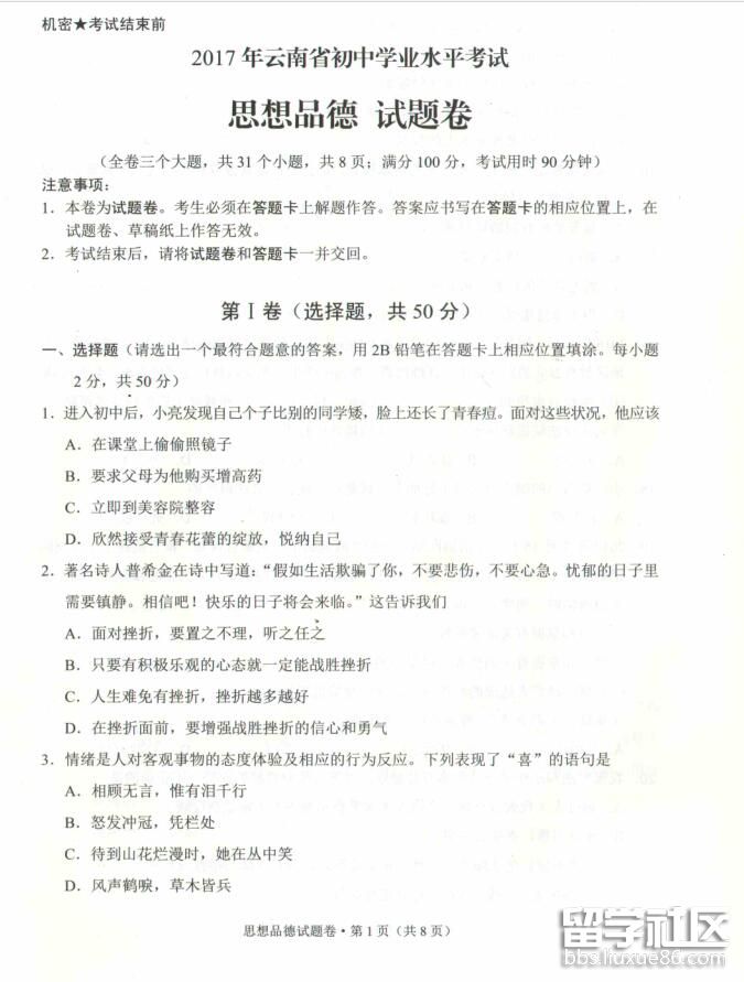 放松心情,去迎接中考過后的生活吧,出國(guó)留學(xué)網(wǎng)中考頻道會(huì)及時(shí)為廣大考生提供[2017年云南中考政治試卷],也歡迎大家了解更多關(guān)于中考分?jǐn)?shù)線、成績(jī)查詢、志愿填報(bào)、錄取查詢的信息!中考頻道與你同在!