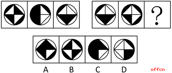 5.【C】 解析:根據(jù)第一組圖可知:黑+黑=黑,白+黑=白,黑+白=白;照此規(guī)律,符合答案的選項(xiàng)有且只有C項(xiàng)。