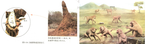 從這些例子可以看出,具有社會行為的動物群體內(nèi)往往形成一定的組織,成員之間有明確的分工,有的群體中還形成等級。這是社會行為的共同特征。
